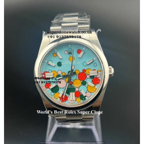 Break the mold of traditional horology with the extraordinarily playful and highly coveted Rolex Oyster Perpetual Celebration Dial 1:1 Super Clone Watch. This masterpiece features the iconic "bubble" motif, reuniting the vibrant lacquer colours of the 2020 OP lineup—candy pink, turquoise blue, yellow, coral red, and green—set against a stunning turquoise background. Housed in a heavily polished, premium 904L Oystersteel case with a smooth domed bezel, it offers a breathtakingly unique wrist presence. Serious collectors understand that sourcing an accurate rolex super clone UK requires absolute mastery over the dial's intricate printing, ensuring the black outlines and colour fills of each bubble are razor-sharp. As the industry leader for Super Clone Watches UK, we guarantee a meticulously engineered replica that perfectly mirrors the authentic weight, visual depth, and mechanical reliability of the genuine article, tailored for the elite professionals of London and the visionary creatives of Manchester.
