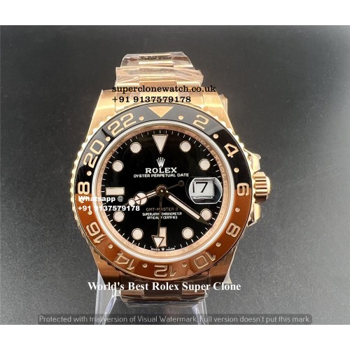 Make an uncompromising statement of wealth and refined taste with the Rolex GMT-Master II 126715CHNR "Root Beer" 1:1 Super Clone Watch in Full Rose Gold. Evoking the rich heritage of vintage GMT models, this modern execution is elevated to the pinnacle of luxury with its heavy-duty 904L Oystersteel core thickly wrapped in radiant 18k Everose Gold. Paired with the flawless brown and black split-colour Cerachrom ceramic bezel, it delivers a warm, incredibly sophisticated wrist presence. We understand that sourcing an accurate rolex super clone UK requires absolute trust, particularly when it comes to the exact hue and longevity of gold plating. As the undisputed leader for Super Clone Watches UK, we guarantee a heavy-weight masterpiece that is visually, texturally, and mechanically indistinguishable from a genuine solid gold Rolex.